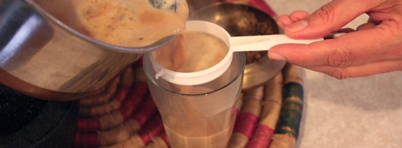 She's already cleaning up and I spot a small clear glass with a light pastel orange coloured liquid and steam feverishly gushing out of it.